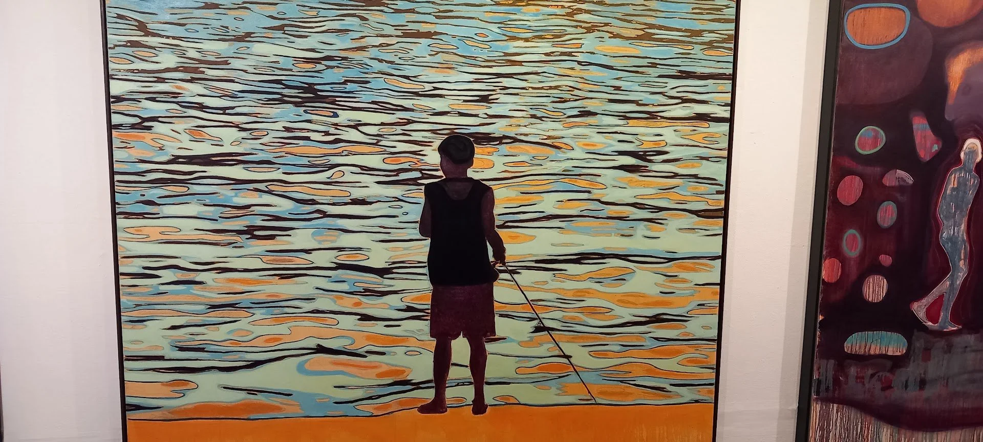 Which leads me to puzzle over Anney White’s quieter, maybe more conventional abstract painting upstairs from the Cooper Gallery. She manages to transform a 2-D painting into something full of movement, a canvas escaping the confinement of its framing. Both Helen and I pause at White’s canvases, attracted by the sheer pleasure of how pattern and colour suggest energy and fluidity, a reaching out of the frame as if to engage in a more expansive conversation with its outside. Helen and I talk about the tension between the frame and the art framed within. I read and loved White’s artist statement. It forms a puzzling over why and what she has done, and reads less like an explanation of her art and more of an enquiry, an openness to the process of making—‘how a mark can serve as a form of control, but also an act of release. Paint becomes a structure, a gesture, a question. These works are not meant to resolve’. I loved the tonal vulnerability also hinted at in her statement. To my mind, this is the most interesting kind of artist ‘statement’ there is. Less an assertion, more a probing. A conversation with the art made.