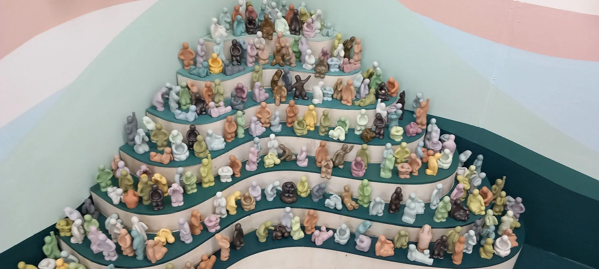 Gail: Yes, playfulness. When we were in what seemed like the downstairs dungeons of the Crawford building, we came across two marvellous instances of playfulness. Jessica Pound’s fun cardboard spaceship documents what might be seen on planet Earth by an alien being. In her spaceship, the control panel, the celluloid film canisters and spools, and also developed photographs of humans and their activities are all, surprisingly, made of ceramic. The latter present as if they might be photographic ‘negatives’ (albeit in red and white instead of black and white), their wonderfully detailed and realised snapshots of human activity remind me of artisanal wood or linocuts, and I think the deliberate swerve away from a professionalised glossy artefact or high concept scifi is heartening. Finally, Joy Jenning’s display—a multiplicity of little smooth and textured humanoid figurines in different poses and colours, ‘The Formables’ (what a wonderful name)—is so much fun! These figurines suggest a variety of emotional states both negative and positive, and are grouped together in communal huddles, each figure interacting with others to suggest relationships, an act of interaction, an offer of help even. Viewers are encouraged to take them up, to rearrange them, to ‘create, arrange, project, play, identify, engage, wander and wonder with them in the landscape’, and there are prompt cards to help initiate the play. In doing so, conversations about identity, belonging, and well-being might well arise, encouraging players to move beyond feelings of isolation and inadequacy. Oh, to be able to touch and finger art!